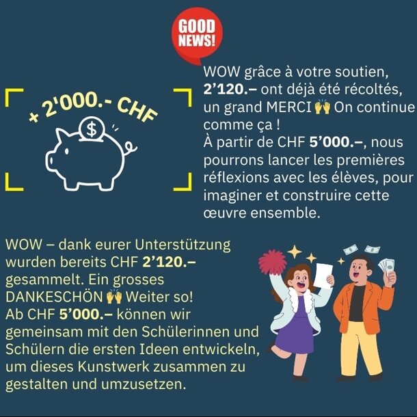 FR WOW grâce à votre soutien, 2’120.– ont déjà été récoltés, un grand MERCI ? On continue comme ça ! À partir de CHF 5’000.–, nous pourrons lancer les premières réflexions avec les élèves, pour imaginer et construire cette œuvre ensemble. DE WOW – dank eurer Unterstützung wurden bereits CHF 2’120.– gesammelt. Ein grosses DANKESCHÖN ? Weiter so! Ab CHF 5’000.– können wir gemeinsam mit den Schülerinnen und Schülern die ersten Ideen entwickeln, um dieses Kunstwerk zusammen zu gestalten und umzusetzen.