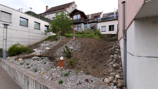 Der Hang neben dem Brückenkopfgebäude Eglisau (BachserMärt, MedBase, Apotheke, Kinderkrippe, Spitex) soll mit einer Trockenwiese mit Wildstauden aufgewertet werden. Es entsteht ein natürlicher Standort für einheimische Pflanzen und dadurch ein wertvoller Lebensraum für Tiere. Die farbige Vielfalt wird die Passant*innen erfreuen.