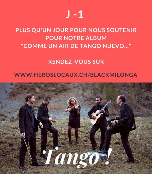 -> www.heroslocaux.ch/blackmilonga <- Demain se termine notre crowdfunding et une nouvelle aventure commence pour le Black Milonga. Grâce à vos nombreux et généreux soutiens, le quintette va enregistrer un album cet été avant de vous le présenter en vernissage, puis de partir pour une petite tournée. Si vous souhaitez assister au vernissage, précommander un CD, prendre un cours avec votre musicien préféré, voir Julien Tudisco et Bastien Monnet danser un tango, N'HÉSITEZ-PLUS -> vous pouvez encore le faire jusqu’à demain ! -> www.heroslocaux.ch/blackmilonga <- UN GRAND MERCI !