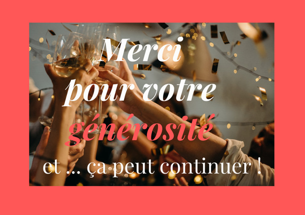 Un énorme M E R C I à vous toutes et tous pour vos contributions. Nous avons non seulement atteint le seuil minimum, mais aussi dépassé le 2ème !! Et ceci grâce à ... VOUS ! Incroyable ! Mais ... la campagne n'est pas encore terminée ! Essayons d'aller toujours plus haut ce qui nous permettra de finaliser le projet dans des conditions encore meilleures et qui sait peut-être nous permettra d'acheter deux magnifiques robes rouges pour Julien et Bastien et leur danse tant attendue ! Continuez à en parler autour de vous ! Portez-vous bien et merci encore, nous sommes très touchés par votre générosité ! Les BLACKS