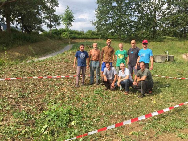 Dem Gestrüpp auf dem Bauplatz beim Bergholz ist es am 18.8. an den Kragen gegangen. Zu zwölft haben Mitglieder des Kletterclubs einen Vormittag lang gerodet und schon mal den Grundriss des Fundamentes auf dem Platz markiert.