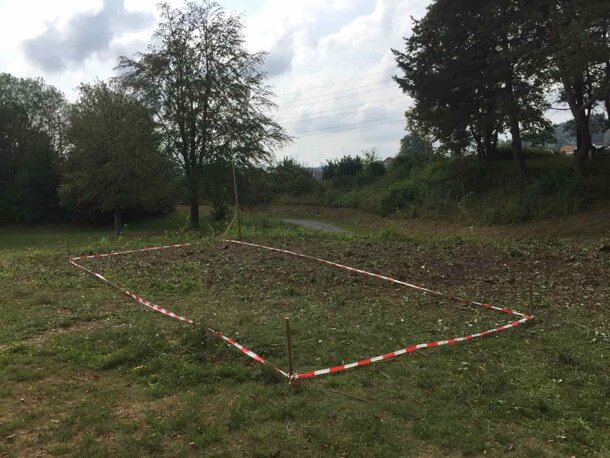 Dem Gestrüpp auf dem Bauplatz beim Bergholz ist es am 18.8. an den Kragen gegangen. Zu zwölft haben Mitglieder des Kletterclubs einen Vormittag lang gerodet und schon mal den Grundriss des Fundamentes auf dem Platz markiert.