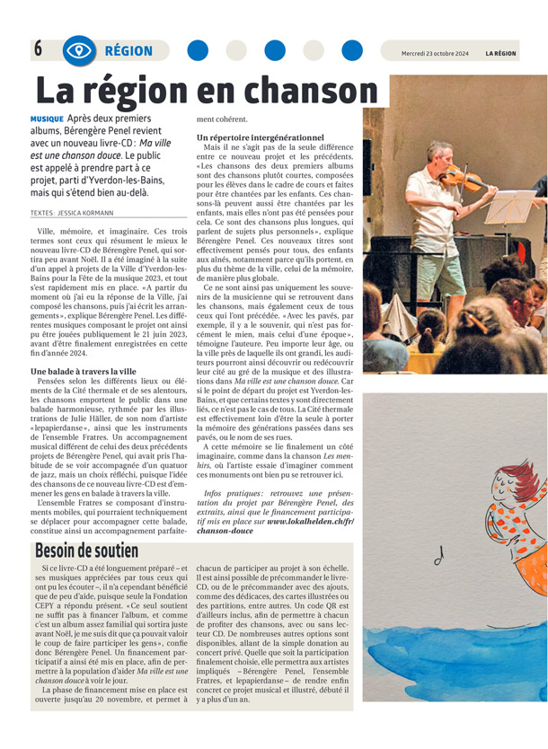 Bonjour à toutes et tous, Nous nous réjouissons de fêter avec vous la sortie de "Ma ville est une chanson douce" Pour cela, RDV le 7 décembre à 11:00. Rue des philosophes 13 - Yverdon-les-Bains Dès11:30 nous vous interpréterons quelques chansons de l'album puis entre partages et discussions, vous pourrez recueillir vos commandes, jusqu'à 14:00. Tous les musiciens et l'artiste-illustratrice seront présents! Afin que nous puissions nous organiser au mieux, merci de confirmer par mail info@berengere.ch votre présence à cet événement, ainsi que le nombre de personnes vous accompagnant. S'il ne vous est pas possible de venir ce jour là, vous recevrez vos commandes par un autre biais, selon un arrangement préalable. C'est une fête que de voir éclore ce projet et peut-être entendez-vous jusque loin loin loin, mon cœur chanter Youhouhou et Merciiii! Bérengère