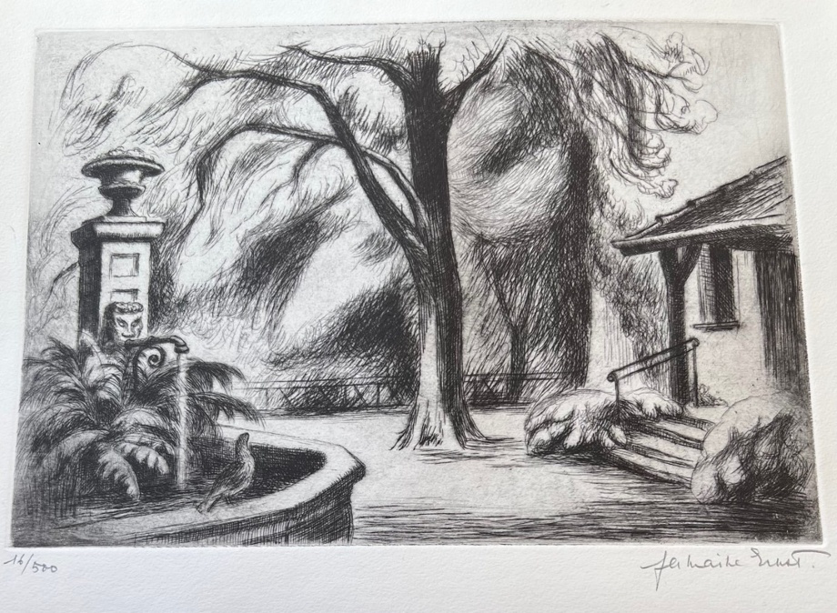 Gravure de Germaine Ernst vue du Château entre 1960 et 1975.