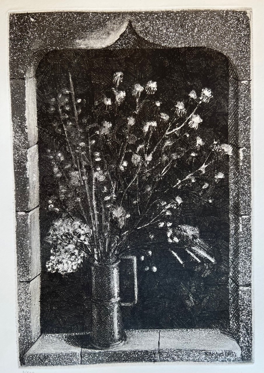 Gravure taille-douce sur papier vélin intitulée "Le Bouquet", réalisée par Renée Yolanda Hauser en 1967.