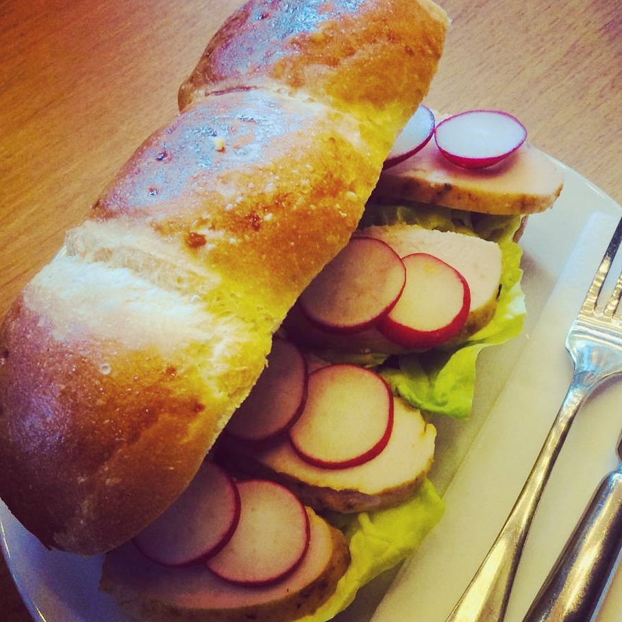 Geniesse ein Sandwich oder Wienerli mit Suppe oder Salat mit einem Getränk (unalkoholisch) deiner Wahl.