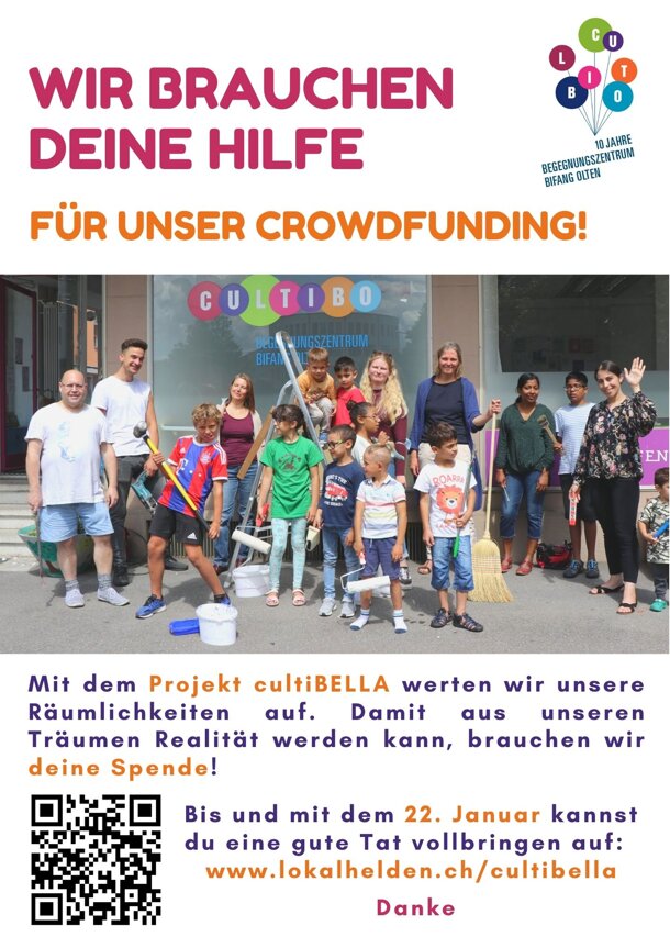 Liebe Fans und liebe Unterstützer, Gerade sind wir mit dem CultiBella-Projekt in die Finanzierungsphase gewechselt. Das bedeutet, dass ab jetzt auf der lokalhelden-Webseite für die Cultibo-Verschönerung gespendet werden kann. Auch über die Cultibo-Webseite kann man nun direkt zum Projekt gelangen (Danke an Beate!), und den aktuellen Stand mitverfolgen. Wir freuen uns, dass es endlich losgeht und sind sehr gespannt, wie es anlaufen wird. Je mehr Menschen weiterhin von unserem Vorhaben erfahren, desto grösser sind die Chancen, dass es erfolgreich sein wird. Also erzählt euren Freunden, Bekannten, Kollegen davon, aber auch der Oma ;-). Und helft uns, Euch und sie alle in 2022 im umgestalteten und verschönerten Cultibo begrüssen zu dürfen. Stellt Euch das tolle Gefühl und die Dankbarkeit vor, wenn wir alle im "neuen" Cultibo stehen und merken: "So etwas Grosses haben wir gemeinsam geschafft, weil wir alle ein Stück mitgeholfen haben!" Mit lieben Grüssen Christiane vom cultiBELLA-Team