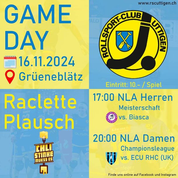 Finanziell kommen wir unserem Projektziel immer näher, aber auch sportlich können wir heute einen riesigen Schritt vorwärts machen: Um 20:00 Uhr findet das Rückspiel gegen den ECU RHC statt und bei einem Sieg qualifizieren wir uns für die Gruppenphase. Komm vorbei und sei dabei, wenn wir RSC Uttigens Geschichte weiterschreiben, indem wir das erste Champions League Spiel in der Grüeneblätzhalle veranstalten!
