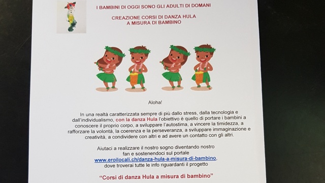 Organizzazione corsi di danza Hula: realizzazione di pacchetti di 10 lezioni di un’ora, con saggio finale. L’intento è quello di creare uno o più corsi annuali (anno scolastico). Il corso prevede anche delle uscite in natura per la raccolta di bastoncini di legno e sassi, che verranno utilizzati come strumenti per i balli, nonché la raccolta di fiori, sempre all’aperto, per la creazione di Lei-collane. I bambini potranno creare la propria gonna in stoffa, coinvolgendo anche i genitori.
