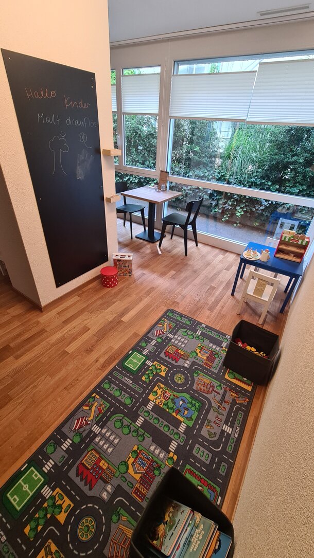 Die Terrasse mit den Schatten spendenden Platanen bleibt natürlich bestehen. Auch drinnen steht nun ein grosser Begegnungtisch. Die Vernetzungswand besteht weiter, neu gibts ein Büchergestell um im Spielraum stehen nun auch Tische zum Käfelen für die Begleitpersonen der Kids.