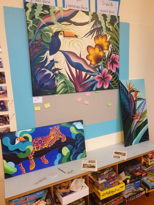 Hanae est une artiste japonaise, maman de 2 membres de l'École Vivante. Elle vous propose une toile acrylique originale, inspirée des couleurs de la faune et de la jungle.