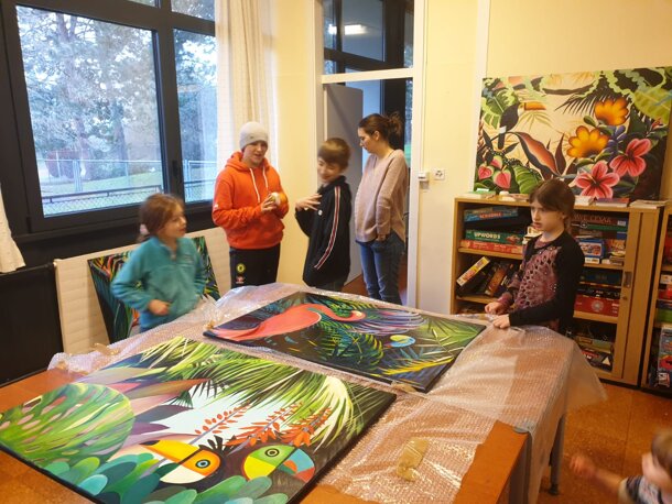 Hanae est la maman de 2 jeunes membres de l'École Vivante. Artiste japonaise, elle a gentiment fait cadeau de 2 tableaux pour notre école. Chacun a pu exprimer ses préférences, ses impressions et partager son ressenti sur les 8 toiles exposées. Le choix a été difficile et comme toutes les décisions prises dans l'école, nous avons voté sur le principe une personne = une voix. Nous avons choisi nos 2 toiles : "Le réveil" et "Le jaguar". Merci