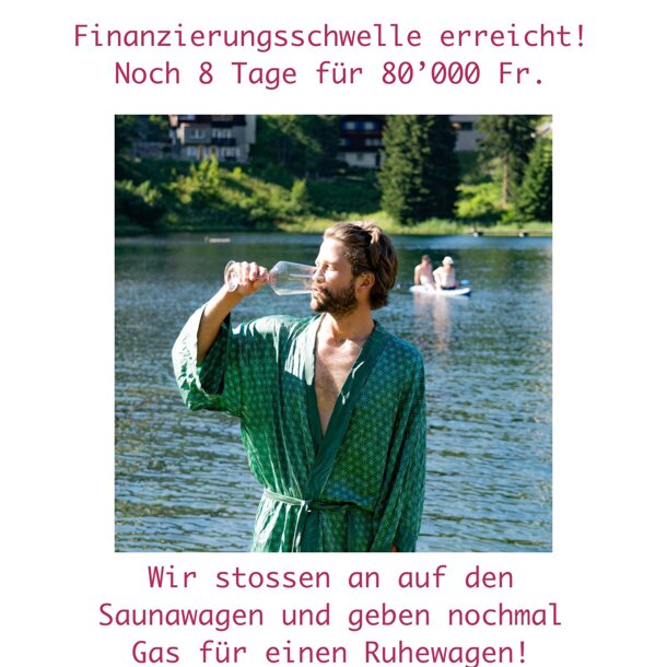 Übers Wochenende haben wir die Finanzierungsschwelle geknackt: Hurra, die Eisbadi Arosa wird wahr! Ihr habt es möglich gemacht, vielen herzlichen Dank. Mit dem gesammelten Geld können wir einen Saunawagen bestellen. Unser Ziel sind 80'000Fr., damit wir auch einen Ruhewagen aufstellen können. Wir haben noch 8 Tage! Mobilisiert euer Umfeld, zusammen schaffen wir die Finanzierung des ganzen Projekts!