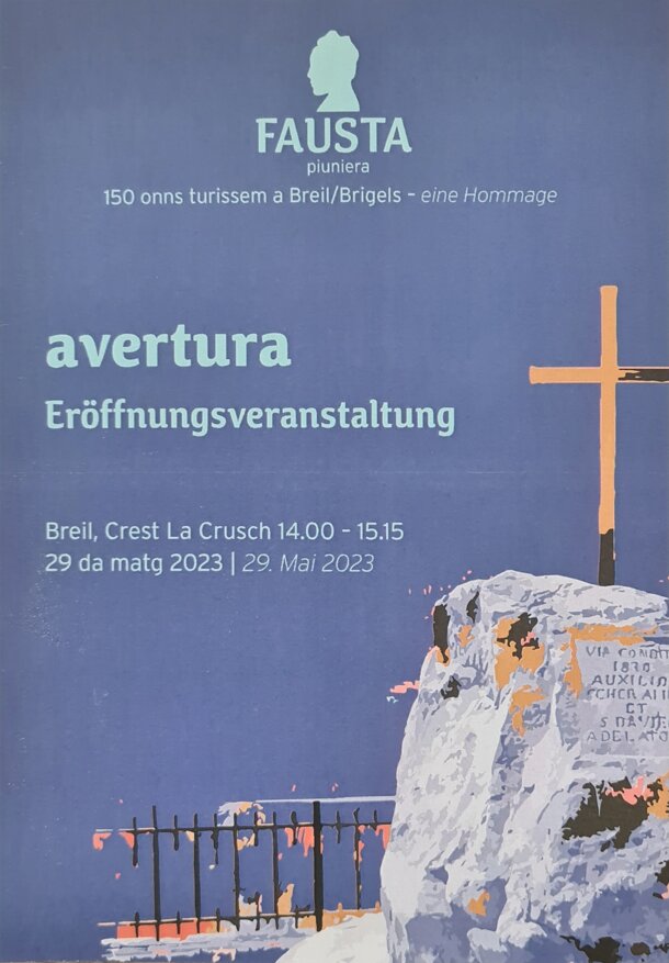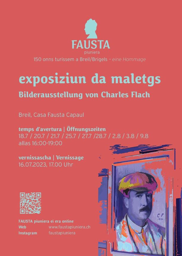Liebe Fans und Unterstützer*innen des Projektes "FAUSTA piuniera 150 onns turissem a Breil/Brigels - eine Hommage" Il comité d’organisaziun ‘FAUSTA piuniera’ selegra dad envidar vus alla vernissascha dall’exposiziun da maletgs Charles Flach. Im Rahmen unseres zweisprachigen Projektes zu Ehren der Tourismus Pionierin Fausta Capaul wird die Bilderausstellung von Charles Flach, Künstler und langjähriger Fausta Gast eröffnet. Die Vernissage findet statt am: Sonntag, den 16.07.2023, 17:00-18:00, Casa Fausta Capaul, Breil/Brigels Program: Beinvegni - OK Präsident Otmar Seiler Maurus Cathomas - Eigentümer Casa Fausta Capaul und Verantwortlicher der Bilderausstellung Annadora Friberg/ Michael Friberg - über Leben und Werk von Charles Flach Intermezzo - Musik ‘FAUSTA piuniera’ von Fiona Cavegn David Flepp - Regisseur ‘FAUSTA piuniera’ mit einer Vorschau auf die Freilichtaufführungen ab 04.08.2023 Viva cun vin vuclina - offeriu da ‘FAUSTA piuniera’ Entrada gratuita. Ils plazs ein limitai. Die Öffnungszeiten der Bilderausstellung finden Sie im Anhang. Cordials salids e sin seveser a Breil Das OK FAUSTA piuniera