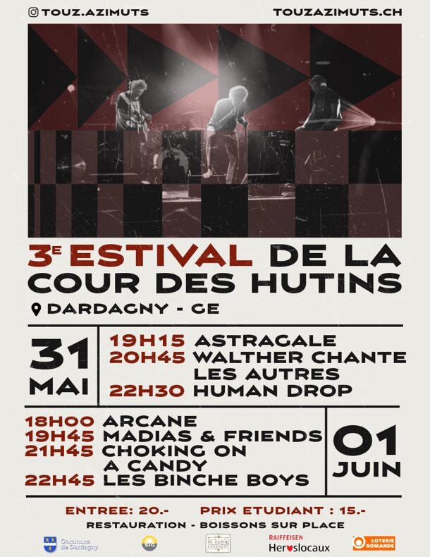 Chères Donatrices et chers Donateurs, Grâce à votre don, et à l'appui de la Raiffeisen ainsi qu'à de généreux sponsors nous pouvons vous informer que le 3ème Estival aura bien lieu. Merci encore et faites-nous l'amitié d'assister à cet Estival, nous serons heureux de vous y rencontrer ! Pour Touz'Azimuts : Philippe de Choudens