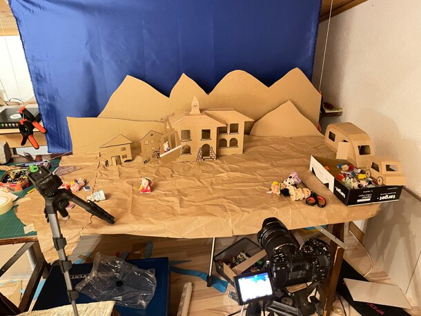 Voici une question que l'on nous a souvent posée... Et voici la réponse... D'abord il a fallu créer les décors en carton en s'inspirant des éléments visuels de la région... pont, bâtiment, écoles... Trouver les photos, reporter en dessinant sur le carton puis couper, coller, monter les bâtiments, la caravane... Une fois le cartonnage terminé, installer le studio photo , les flashs, mettre l'appareil sur trépied... et commencer les prises de vues. A chaque mouvement, déplacer légèrement les personnages (ou les animaux !) et la caravane... 1 ou 2 cm entre chaque prise de vue. Une fois les environ 1'200 photos dans la boîte, monter les vidéos en choisissant une fréquence de 4 à 10 images par seconde et donner vie à l'histoire en important les premières vidéos. S'ensuit un méticuleux travail d'accélération ou de ralentissement pour coordonner les gestes. Ajouter quelques bruitages ... et demander à de supers amis musiciens une magnifique musique originale ! Ajouter encore quelques titres et mots-clés et le tour est joué ! J'espère que vous aurez eu autant de plaisir à visionner la vidéo que ce que j'ai pris comme plaisir à inventer l'histoire ! N'hésitez pas à la partager autour de vous le lien du projet... www.heroslocaux.ch/biblio-mobile Si on arrive à avoir autant de visionnage que j'ai eu à prendre de photos, je serais super heureux !!!