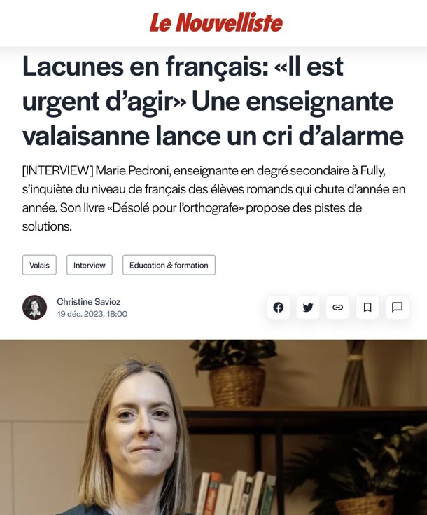 Une enseignante de français a publié un livre, car il est « urgent d'agir » pour augmenter le niveau de français des jeunes élèves... https://www.lenouvelliste.ch/valais/lacunes-en-francais-il-est-urgent-dagir-une-enseignante-valaisanne-lance-un-cri-dalarme-1349861 D'avance merci à vous de parler de notre projet de bibliothèque itinérante à vos contacts et à vos amis ;-)