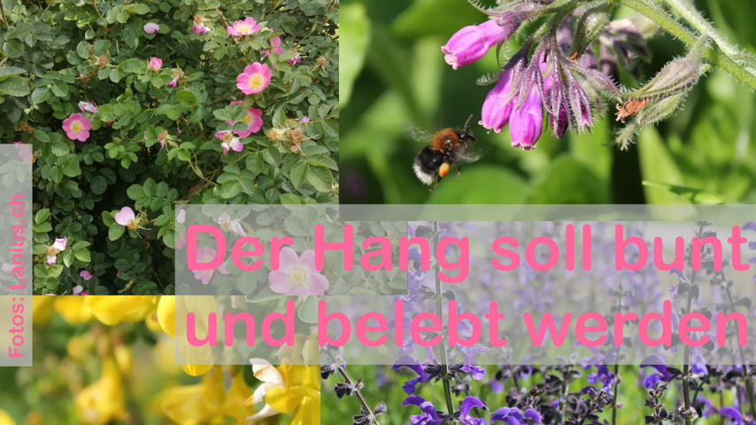 Der Hang neben dem Brückenkopfgebäude Eglisau (BachserMärt, MedBase, Apotheke, Kinderkrippe, Spitex) soll mit einer Trockenwiese mit Wildstauden aufgewertet werden. Es entsteht ein natürlicher Standort für einheimische Pflanzen und dadurch ein wertvoller Lebensraum für Tiere. Die farbige Vielfalt wird die Passant*innen erfreuen.