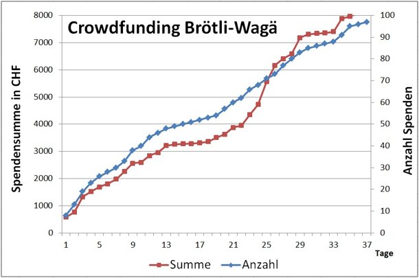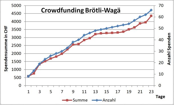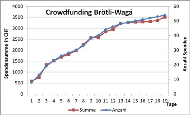Liebe Brötli-Wagä-Fans, Unser Projekt erlebt nach einer Abflachung wieder einen Boost: Die Spendenkurve klettert wieder steiler nach oben :) Das benötigen wir auch dringend! Das erste Drittel ist geschafft - aber bereits die Hälfte der Zeit ist verstrichen. Schaffen wir es? Meine wiederholte Frage: Hast du bereits deine e-mail Kontakte über dieses Projekt informiert? Dann gibt es noch SMS, für all diejenigen die kein WhatsApp, Signal, Threema haben. Facebook, Tictoc, Telegram, Vimeo, Instagram? Alle Freund*innen dürfen damit "genervt" werden - wenn jeder 5 CHF spendet, dann haben wir es geschafft! Aber ebe - wie bringen wir alle dazu 5 CHF zu spenden? Bislang sind es genau 4 Spenden à 5 CHF. Da liegt sicher noch was drin. Schreibt eure Ideen einfach in die Pinnwand. Es schöns Wuchenend, Fabienne