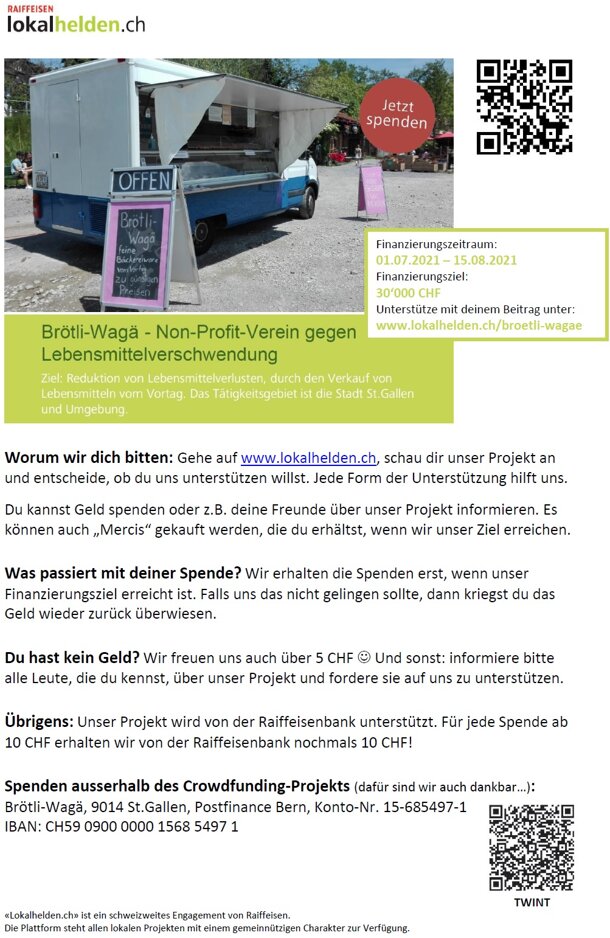 Guete Morge an alli Brötli-Wagä-Fans Vorweg: Wer möchte, dass dieses Projekt erfolgreich ist, der ist aufgerufen jetzt zu handeln. Willst du dir etwas Zeit nehmen? Wenn ja, bitte weiterlesen. Die Anzahl Unterstützer nimmt langsam aber stetig zu. Wir liegen bei 22% Finanzierung. Die Anzahl Fans stagniert. Was können wir tun? Hast du bereits deine e-mail Kontakte über dieses Projekt informiert? Dann gibt es noch SMS, für all diejenigen die kein WhatsApp, Signal, Threema haben. Facebook, Tictoc, Telegram, Vimeo, Instagram? Gestern war ich Flyer verteilen und habe 5 Briefe geschrieben. Oldstyle... wer macht mit? Zudem habe ich Jugendliche getroffen und aufgerufen uns auf Instagram zu folgen --> wir haben schon über 60 Follower :) Götti, Gotti, Grosseltern, Kinder, Enkelkinder, Verwandte, Nachbarn --> nutze das Projekt um mit Leuten ins Gespräch zu kommen, die du schon lange nicht mehr kontaktiert hast. Mir säged Danke! Und freued üs uf e witerei spannendi Wuche :) Fabienne, mit em Brtötli-Wagä-Team