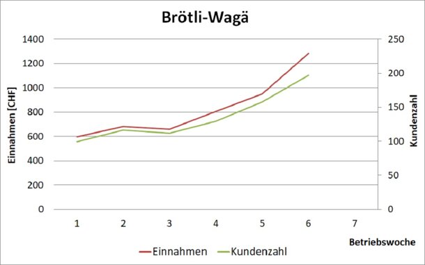 Liebe Brötli-Wagä-Fans, Was meint ihr: Wie viele von euch Fans haben den Brötli-Wagä bereits unterstützt? Die Lösung gibts weiter unten. Wir durften das Projekt verlängern und die erste Woche zeigt: Es könnte funktionieren! Wir haben 97 Fans, 111 Unterstützer und zurzeit 11'100CHF im Pot. Im Durchschnitt haben wir also pro Person grosszügige 100CHF erhalten! Aber hey: Wir freuen uns über jeden noch so kleinen Beitrag. Es zeigt uns auch, dass es viele Personen gibt, die vor allem auch die Idee unterstützen. Das motiviert uns weiterzumachen! Ich befürchte jedoch, dass einige eurer Spendenüberweisungen nicht geklappt haben. Am besten mal nachschauen ob das Geld bei euch weg ist :) Die Lösung: von 97 Fans haben uns bislang 41 unterstützt. Und dafür möchte ich mich ganz herzlich bei jedem einzelnen bedanken! Die Fans unterstützen das Projekt vorwiegend mit der Verbreitung von Informationen und indem sie andere Personen dafür gewinnen für uns zu spenden. Aber natürlich wäre es toll wenn jeder Fan schliesslich ebenfalls noch 5CHF beisteuern könnte ;) In der Zwischenzeit machen wir weiter mit Flyer verteilen, Sponsoren suchen, Beiträge veröffentlichen, neue Standorte und einen neuen Parkplatz suchen, und und und. Die Arbeit geht uns nicht aus. Übrigens: Wir suchen einen Geschäftsführer für den Brötli-Wagä. Bei Interesse - einfach melden. No e gueti Restwuche und bis bald, Fabienne