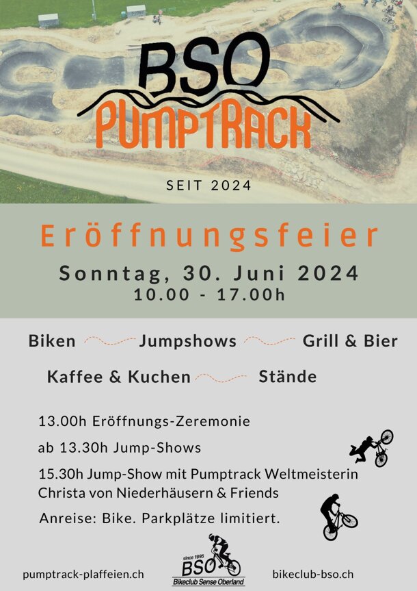 Liebe Unterstützer:innen Dank eurer Unterstützung gibt es den BSO Pumptrack in Plaffeien. Herzlichen Dank für euren Beitrag! Wir freuen uns riesig auf die Eröffnungsfeier am Sonntag, 30. Juni 2024. Es würde uns freuen, euch zahlreich begrüssen zu dürfen und mit euch auf das erfolgreiche Projekt anzustossen. Mehr Infos zum Anlass findet ihr im Anhang. Sportliche Grüsse Thomac, Valeska, Janine, Simon, Damian und Manuela