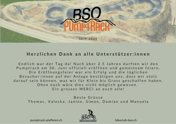 Der Bikeclub Sense-Oberland (BSO) hat bereits einen Bikepark mit Kieswegen. Dieser ist im Unterhalt sehr zeitaufwendig und nur durch Mountainbikes befahrbar. Unsere Vision: Ein Pumptrack für alle! Für gross und klein, für den ambitionierten Biker wie auch Trottinette- oder Skateboard-Fahrer, unser Projekt soll alle ansprechen. Der Pumptrack wird asphaltiert und mit technischen Elementen in einer Skill-Sektion vervollständigt.