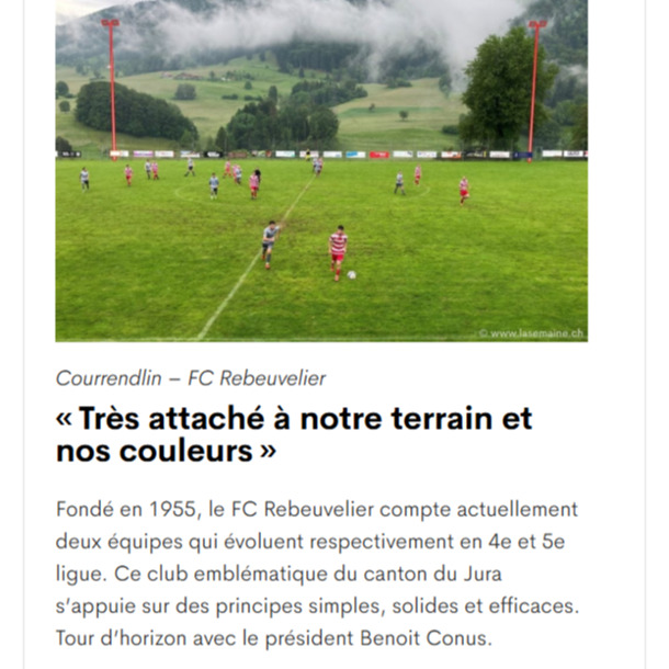 Chers Fans, Chers Visiteurs, Notre levée de fonds joue les prolongations! En effet, la plateforme de la Raiffeisen nous a octroyé un délai supplémentaire jusqu'à la fin du mois. On respire, on s'organise et on sort notre dernier atout. Un atout? Le jass, évidemment! Le traditionnel jass du FC Rebeuvelier aura lieu le vendredi 27 février. Nous avons toutes les cartes en main (oui, elle était facile) pour combler le solde de notre crowdfunding. Alors on compte sur vous pour vous inscrire et terminer cette aventure en beauté. Les inscriptions se sont par WhatsApp au 076 281 54 13. Plus d'informations sur https://www.fcrebeuvelier.com Le FC fait la une (ou presque) Notre club est à l’honneur dans l’hebdomadaire La Semaine. Le journaliste Olivier Odiet s'est entretenu avec votre serviteur sur l'état du club et ses projets en cours. Un article à ne pas manquer via le lien ci-dessous. On vous encourage à vous y abonner ! Amicalement, Benoît Conus, président FC Rebeuvelier