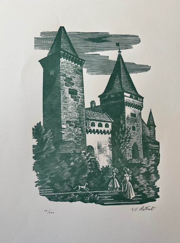 Xylogravure de couleur vert foncé sur papier, du Château de La Sarraz, réalisée par Aldo Patocchi en 1969.