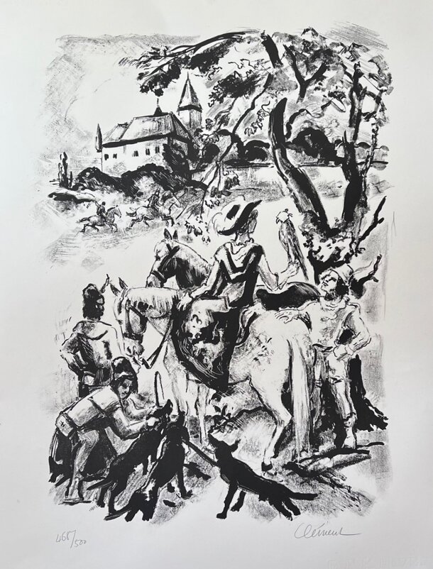 Gravure de Charles Edouard Félix Clément, représentant des chevaliers et le Château de La Sarraz, entre 1960 et 1972.