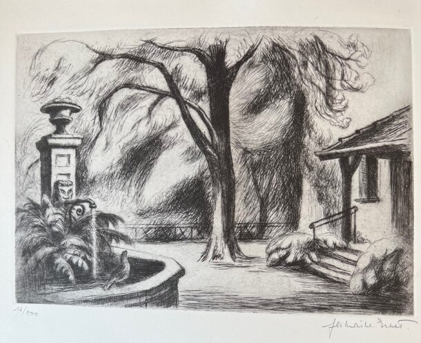 Gravure de Germaine Ernst vue du Château entre 1960 et 1975.