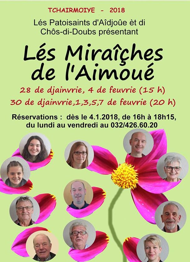 Bonjour tout le monde Déjà un grand merci à tous nos marraines et à nos parrains qui ont permis d'atteindre plus de 79'000 francs jusqu'à ce jour. Mais la règle hyper dure du Crowdfunding, c'est tout ou rien ! Ce qui signifie que si l'objectif n'est pas atteint, chaque contributeurs sera remboursé. Il est impératif pour que l'aventure de notre restaurant extraordinaire voit le jour que nous arrivions dans 11 jours au montant minimum de 90'000.-, donc diffuser un maximum auprès de votre famille, vos amies et amis et vos connaissances... Pour aboutir à notre compagne, c'est maintenant, on compte sur vous. De notre coté, on ne ménage pas nos efforts ! Samedi 3 févrie r, nous tenons un stand de vente de pâtisseries au Jura Centre à Bassecourt, venir nous soutenir ! Vous aimez danser ? Alors venez le dimanche 4 février 2018 à notre journée Zumbo ! Venez quand vous voulez à notre magnifique journée zumdo... De la Zumba, de la danse, une bonne ambiance... Nous vous attendons à la Halle de Fontenais pour une journée de Zumbo. Pour le cours de danse, vous glisser ce que vous voulez dans la tirelire géante Prix pour le repas : 12 CHF pour les adultes 6 CHF pour les enfants Gratuit pour les enfants de moins de 5 ans ! Veuillez s'il vous plait vous inscrire au 078 897 22 55 pour manger nos délicieux spaghetti bolo ou pesto ! Les patoisants soutiennent notre association Venez voir les patoisants lors de leur spectacle, une partie de leur bénéfice sera versé en faveur de notre association. Alors..., allez-y, réservez et venez rire un bon coup avec eux ! Merci d'avance à cette équipe qui fait vivre une langue de notre patrimoine.