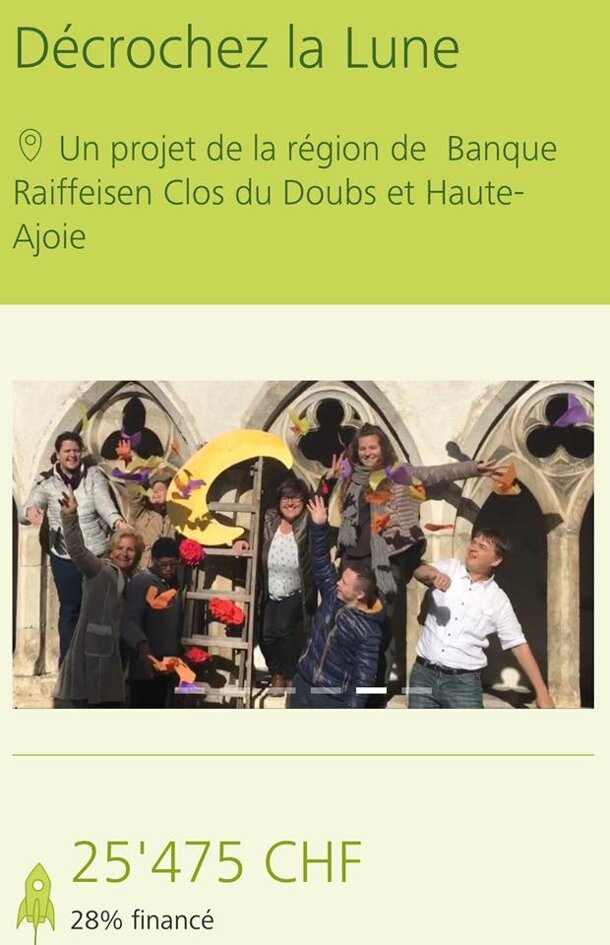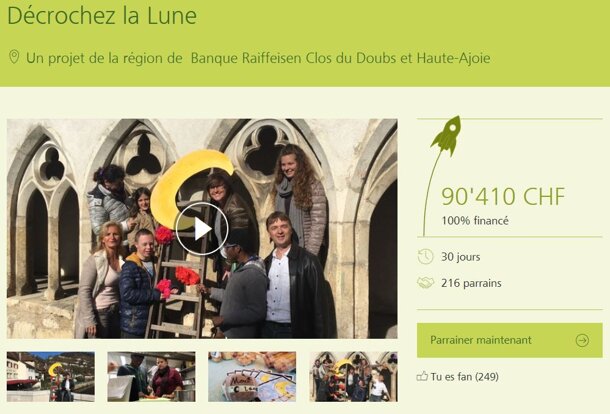 Comme vous pouvez le remarquer, nous avons dépassé le seuil des 25'000 francs, ce qui correspond à ce jour à 28% du financement minimum pour la réalisation de notre projet d’hôtel-restaurant pour personnes en situation de handicap dans le canton du Jura ! Nous sommes encore loin de notre but minimum de 90'000 francs pour sa concrétisation. Merci d'avance à nos 68 parrains qui ont permis d'atteindre ce chiffre. Pour les 148 fans de notre projet via la page héros locaux et les 528 "J’aime" sur notre page Facebook qui n'ont pas encore fait leur promesse de don et qui se disent qu'ils vont le faire plus tard... , il ne reste que 54 jours, alors n'attendez plus. La règle hyper dure du Crowdfunding, c'est "tout ou rien" ! Ce qui signifie que si l'objectif n'est pas atteint, chaque parrain ne versera pas sa promesse de "Merci" ou de don ! La réalisation et l'avenir de notre projet passe par votre générosité et votre soutien, alors surtout participez, parlez-en à vos amies, amis, famille, connaissances…, et continuez de partager au maximum le lien de notre campagne de récolte de dons en faveur de " Décrochez la Lune ". Besoin de plus d’information, notre page Internet est là pour vous : Décrochez la Lune Pour faire décoller la campagne, c’est maintenant, on compte sur vous pour décrocher la lune ! Noël, c'est dans quelques jours, alors pensez à nous, à eux ! Très douces et jolies Fêtes de Fin d’Années à toutes et à tous avec Mille MoMents de Magie. Merci du fond du cœur pour votre générosité