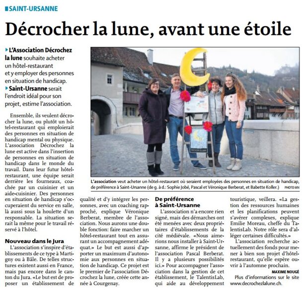 "Décrochez la Lune" projette d'ouvrir un hôtel-restaurant dans le Jura engageant une quinzaine personnes en situation de handicap entourées de professionnels de la branche, avec une adaptation de leurs places de travail et accompagnées par des spécialistes expérimentés [ http://www.decrochezlalune.ch ].