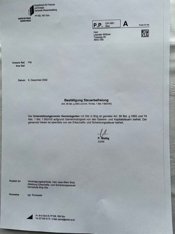 Christoph Gysel Tourismuspfarrer Innere Saastalstrasse 111 3910 Saas-Grund Tel. 079 412 75 18 christoph.gysel@tourismuspfarrer.ch Saas-Grund, 10. Dezember 2022 Liebe Freunde Sogar die Steuerbehörde pusht das Demenzgartenprojekt! Unser Gesuch um Steuerbefreiung wurde positiv beurteilt. Damit können alle Personen ihre Spende bei der persönlichen Steuererklärung in Abzug bringen. Die entsprechende Verfügung ist angehängt. Wenn ihr also Steuern sparen möchtet, engagiert euch (nochmals) bei unserm Crowdfunding-Projekt Demenzgarten. Gutes tun und Steuern sparen, das ist ja fast wie Weihnachten. Übrigens, auch die Raiffeisenbank unterstützt uns, respektiv honoriert euer Engagement. Und vergesst den Benefizanlass vom 16.12.2022, 19.00 Uhr in der ref. Kirche Brig nicht. Ein Anlass vom Feinsten! Danke, wenn ihr weiter Werbung macht. Fans, Unterstützer findet. Und euren Beitrag für die Menschen leistet, die wir nicht vergessen wollen. Zusammen schaffen wir das! Einen Demenzgarten für sie. Ich freue mich, viele von euch am 16. Dezember zu sehen! Bis dahin: Bleibt aktiv! www.lokalhelden.ch/demenzgarten Schön, dass ihr bei diesem Projekt dabei seid! Liebe Grüsse Für den «Unterstützungsverein Demenzgarten» Der Projektverantwortliche Christoph Gysel, Tourismuspfarrer