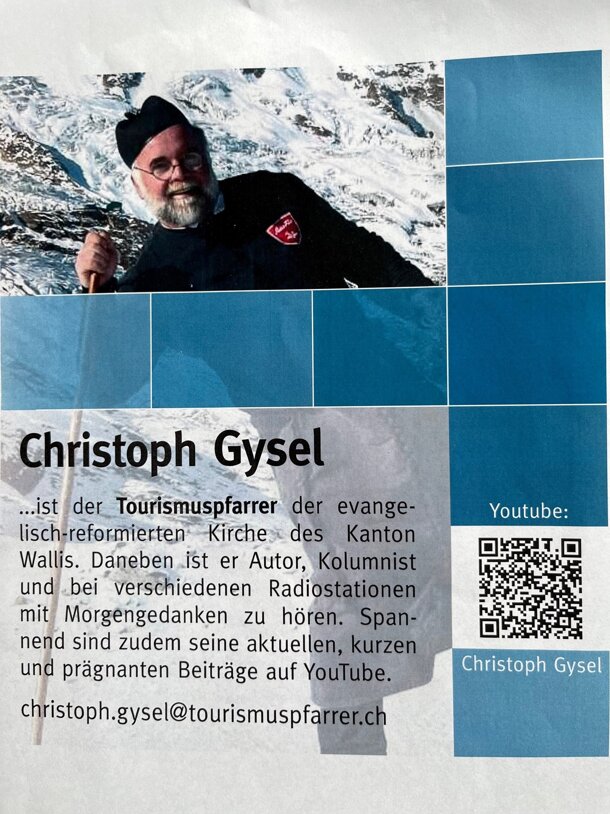 Christoph Gysel Innere Saastalstrasse 111 3910 Saas-Grund Tel. 079 412 75 18 christoph.gysel@tourismuspfarrer.ch Saas-Grund, 24. Dezember 2022 Liebe Freunde Unter diesem Titel habe ich einen YouTube-Beitrag veröffentlicht. Ich erinnerte dabei an Jesus, der sich gerade auch für Kranke und Benachteiligte einsetzte. Ausgerechnet die damals verachteten Hirten, die nichts galten in der Gesellschaft waren die Ersten, die von der Geburt Jesu erfuhren. Den himmlischen Gesang vernahmen. Weihnachten für Loser. Dass wir in diesen Tagen wohlwollend an Benachteiligte unserer Zeit denken, ist von da her sicher gut. Dass Sie das Crowdfunding Demenzgarten für den Seniorentreff Sibylle unterstützen, hat weihnächtlichen Charakter. Den an Demenz erkrankten Menschen wird ein guter, sicherer und schöner Garten geschaffen. Angehörige können ihre Lieben mit einem guten Gefühl für einen Tag abgeben. Die Spenden von jetzt sind also ganz nachhaltige «Weihnachtsgeschenke». Die angestrebte Summe für die Verwirklichung des Demenzgartens haben wir zwar noch nicht erreicht. Doch wenn wir uns alle nochmals einen Ruck geben, Freunde, Verwandte, Nachbarn und Arbeitskollegen auf das Projekt Demenzgarten hinweisen, schaffen wir es. Ich bin zuversichtlich. Bleiben wir dran. Falls ihr erwähnten YouTube-Beitrag hören möchtet. Untenstehender QR-Code führt euch auf meinen Kanal. Ich wünsche euch schöne Weihnachtstage! Liebe Grüsse Für den «Unterstützungsverein Demenzgarten» Der Projektverantwortliche Christoph Gysel