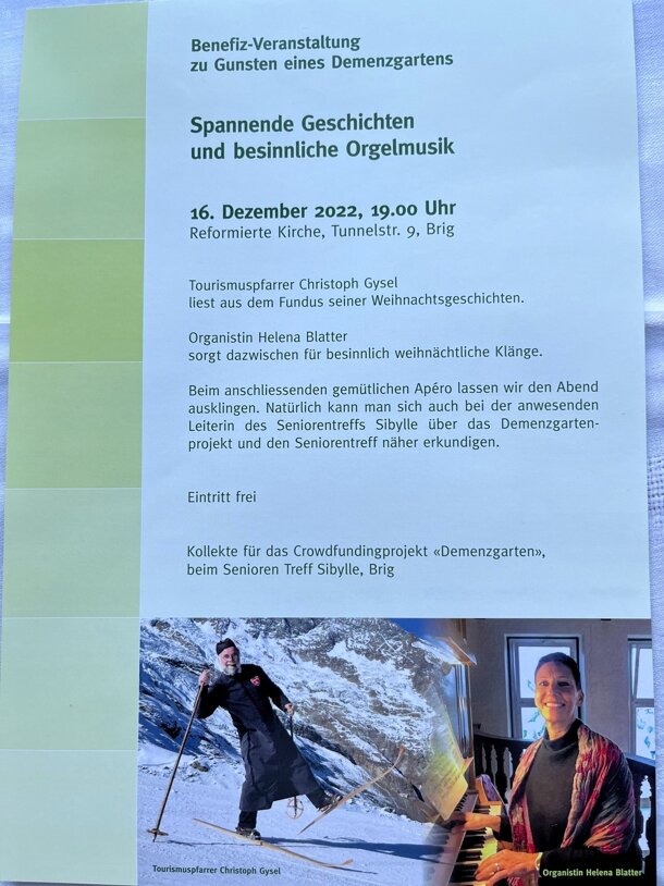 Christoph Gysel Innere Saastalstrasse 111 3910 Saas-Grund Tel. 079 412 75 18 christoph.gysel@tourismuspfarrer.ch Saas-Grund, 14. Dezember 2022 Liebe Freunde Das Crowdfunding für den Demenzgarten schreitet voran. Bald haben wir die Hälfte der Summe zusammen, die wir für einen guten und sicheren Garten gebrauchen. Vielen Dank für alle Unterstützung! Jeder Franken, den wir jetzt in dieser Weihnachtszeit für das Projekt spenden, ist nachhaltig investiert. Die Tagesgäste können sicher ins Freie gehen und die Natur geniessen. Angehörige wissen ihre Demenzkranken an einem guten und schönen Ort. So wird das ganze Jahr über im Seniorentreff Sibylle etwas Weihnachten sein… Allerdings ist das Ziel noch nicht erreicht. Deshalb ist es wichtig, weitere Fans/Unterstützer zu finden. Besucht doch mit Freunden/Verwandten die Benefiz-Veranstaltung vom Freitag, 16.12. 2022, 19.00 Uhr, in der ref. Kirche Brig. Spannende Geschichten, besinnliche Musik, ein geselliges Apéro und Kontakte zu den Verantwortlichen des Projektes, garantieren für einen eindrücklichen Abend. Ich freue mich, viele von euch zu treffen! Vielen Dank für eure Unterstützung! Liebe Grüsse Für den «Unterstützungsverein Demenzgarten» Der Projektverantwortliche Christoph Gysel