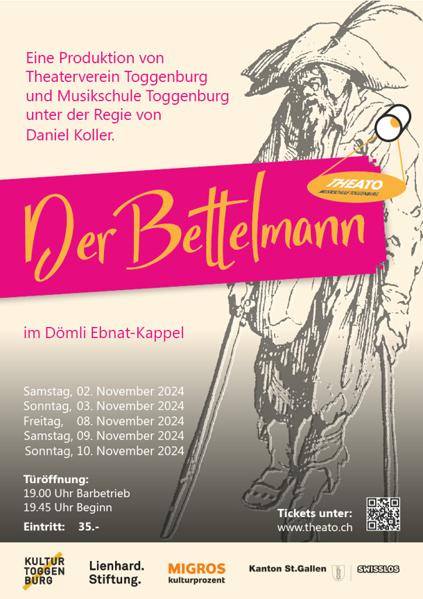 Sehr geehrte Unterstützer... Wir möchten uns für Euer Engagement ganz herzlich Bedanken. Wir erachten es als nicht selbstverständlich, dass Ihr uns finanziell unterstützt. Wir werden das so gesammelte Geld sinnvoll und für die Aufführungen aufwertend einsetzen. Wir freuen uns jetzt schon, wenn wir Euch an einer (oder mehreren) unserer Aufführungen im November begrüssen dürfen. Weitere Informationen findet Ihr unter www.theato.ch Viele Grüsse, das Projektteam "Der Bettelmann"