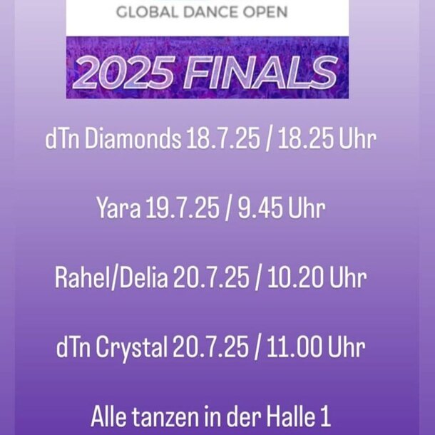 Die Zeiten der Auftritte haben sich geändert! -Freitag, 18.07.2025 dTN Diamonds 20.27 Uhr -Samstag, 19.07.2025 Yara Solo 11:42 Uhr -Sonntag, 20.07.2025 Rael und Delia 12.29 Uhr -Sontag, 20.07.2025 dTn Crystal 13:08 Uhr Hier gehts zum Livestream: https://www.globaldanceopen.com/livestream Alle Tanzen in der Halle 1 Herzlichen Dank für eure Unterstützung!