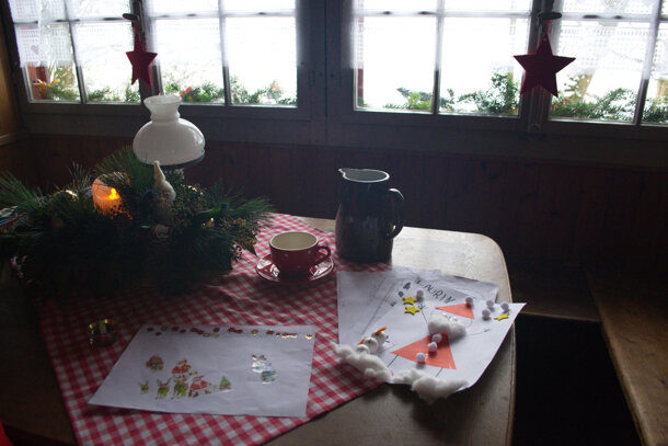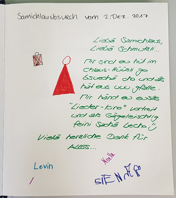 Wir sind nonid an ziel - Jedi Spend zählt. Und noh es chlises Versli: Es dunklet scho im Tannewald und schneielet ganz lisli. Was isch das für es Liechtli det i säbem chline Hüsli? – Da isch de Samichlaus deheim mit sine guete Sache! Er hät scho s Lämpli azündt und tuet grad s Kafi mache Euer Samichlaus