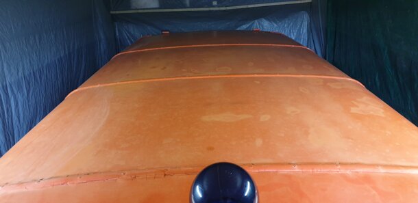 Vor ca. 30 Jahren musste das Fahrzeug für den Feuerwehrdienst in Verkehrsrot umlackiert werden. Diese Lackschicht ist mittlerweile vor allem auf dem Dach des Oldtimers sehr brüchig und hat viele Risse durch die Wasser auf die Dachhaut dringen kann. Daher muss das Dach dringend fachgerecht saniert und neu lackiert werden