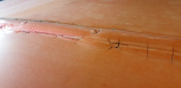 Vor ca. 30 Jahren musste das Fahrzeug für den Feuerwehrdienst in Verkehrsrot umlackiert werden. Diese Lackschicht ist mittlerweile vor allem auf dem Dach des Oldtimers sehr brüchig und hat viele Risse durch die Wasser auf die Dachhaut dringen kann. Daher muss das Dach dringend fachgerecht saniert und neu lackiert werden