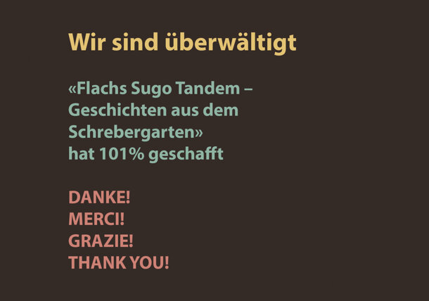 Noch 2 Tage verbleiben um unser Buch Realität werden zu lassen. 86 Prozent haben wir bereits erreicht. Vielen lieben Dank! In letzter Minute bekamen wir ein neues Merci. Das BeeHome Classic von Wildbiene & Partner. «Mit dem Wildbienen-Häuschen BeeHome Classic bieten Sie harmlosen Wildbienen ein wertvolles Zuhause und verbessern die Bestäubungssituation.» Ein grosses Dankeschön an alle die uns und unser Buch unterstützt haben – durch Mitarbeit, Zuspruch, Buchvorbestellung und finanzielle Unterstützung. Herzliche Einladung zur Buchvernissage mit Ausstellung am 23. Mai in der Kulturbuchhandlung Never Stop Reading in Zürich. Weitere Informationen sowie das Datum der Buchvernissage im Neubad in Luzern folgen. Herzlich, das «Flachs Sugo Tandem» Team