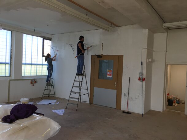 Es macht riesig Freude, zu sehen, wie die Wände so schön weiss werden. Gestern haben uns 4 Jugendliche geholfen und die ganze hintere Wand gemalt. Yasmina und ich (Eveline) sind jeden Tag am Malen und bekommen tolle Unterstützung. Manuel hat mühsam die Decke, die wirklich sehr schwarz war, geputzt. (Es war früher eine Schreinerei im Gebäude, da gab es viel Staub.)