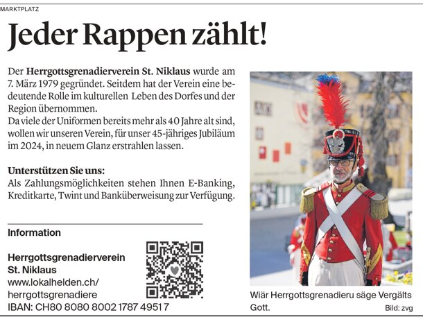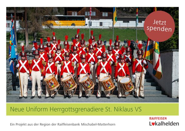 Wir sind nun in der Finanzierungsphase für unser Projekt, neue Uniformen für die Herrgottsgrenadiere anzuschaffen. Wir freuen uns über jede Unterstützung, um unser Ziel zu erreichen. Unterstützt uns jetzt und spendet! Teilt den Link www.lokalhelden.ch/herrgottsgrenadiere mit jedem den ihr kennt. Jeder Beitrag zählt! Vielen Dank für eure grosszügige Unterstützung Euer Herrgottsgrenadierverein