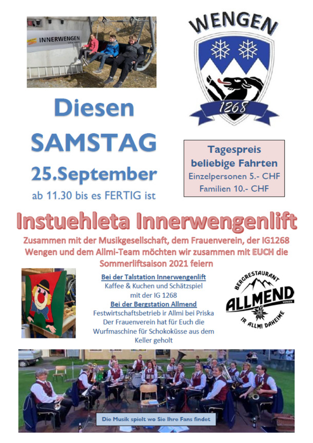 Zusammen mit der Musikgesellschaft, dem Frauenverein, der IG1268Wengen und dem Allmi-Team möchten wir zusammen mit EUCH die Sommerliftsaison 2021 feiern. Schönes Wetter haben wir auch organisiert. Wir freuen uns auf zahlreichen Besuch am und um den Innerwengenlift. Grüsse aus Wengen Eure IG1268 Wengen