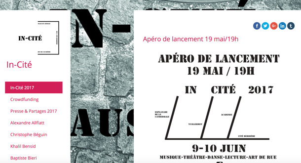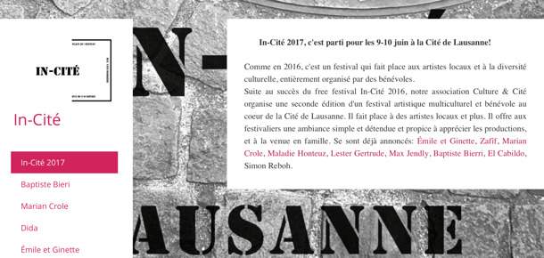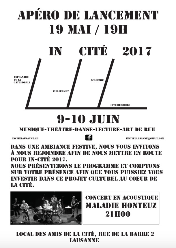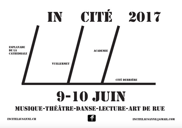 Un grand merci à celles et ceux qui ont partagé notre apéro de lancement hier soir, et en particulier à Maladie Honteuz pour sa présence! Ça y est, le programme avec les lieux et horaires est en ligne: vous pouvez vous y plonger et préparer votre programme. https://www.incitelausanne.ch/programme-in-cité-2017/ Sans oublier notre crowdfunding: le temps passe, et si nous n'atteignons pas notre cible des 5000frs, tout sera perdu :-( Le but est de défrayer nos artistes par autre chose qu'un tour de chapeau. Nous comptons sur vos, ainsi que sur vos talents de bénévoles et techniciens. A tout bientôt à In-Cité 2017! Programme In-Cité 2017 Vendredi 9 juin & Samedi 10 juin 20h00 à 23h00 - Light - In Cité conçu et réalisé par Lise Couchet, Martani et Giuseppe Greco | Installations spaciales lumière et vidéo Vendredi 9 juin 17h00 à 23h00 - Mireille Descombes reçoit Jacques Roman, Pierre Lepori et David Bosc | Sur le pavé, la page - Rue de l’Académie 17h00-17h30 - La lessive et autres histoires de femmes migrantes de Yudit Kiss avec Tania Nerfin & Pascal Cottin | Sur le pavé, la page - Rue Cité-Derrière 18h30-20h00 - La Guinguette avec Émile et Ginette | Musique - Esplanade de la Cathédrale 19h00.19h30 - Anatomie de mon cœur en été Andrea Picci | Sur le pavé, la page - Rue Cité-Derrière 19h30-20h00 - Pot-pourri Jean-Luc Fornelli | Sur le pavé, la page - Rue Cité-Derrière 20h00-20h30 - Paris 1900 Collectif OZ (COZ) | Théâtre - Place de la Cathédrale 21h00-22h00 - Le bruissement du vent Zafîf avec Dida, Khalil Bensid, Ludovic Ottiger et Samir Mokrani | Concert - Esplanade de la Cathédrale 21h00-21h30 - Manu chante Moon Light | Concert - Rue Cité-Derrière 21h30- 22h00 - Boucher chamane André Ourednik - Sur le pavé, la page - Rue Cité-Derrière 22h00-22h30 - Paris 1900 par le Collectif OZ (COZ) | Théâtre - Rue Cité-Derrière 22h00-23h00 - The Currulao El Cabildo avec Arcadio Lopez, Felipe Román, Jorge Lopez et Omar Zabsonre | Concert - Esplanade de la Cathédrale Samedi 10 juin 16h00 à 18h00 - Lecture de rue coorganisée par Bibliomedia, l’Association de quartier Cité-Vallon et In-Cité - Rue de l’Académie 16h00-17h00 - Swing endiablé Les Zezettes Swing avec Chloé Bieri, Baptiste Bieri, David Millioud et Antoine Scheuner | Concert - Esplanade de la Cathédrale 16h00-16h30 - Les voix Solam Riondel et Pascal Cottin | Sur le pavé, la page - Rue Cité-Derrière 16h00 à 18h00 - Concours de dactylo agrémenté de lectures par le Musée de la machine à écrire avec Jacques Perrier et Pascal Cottin | Sur le pavé, la page - Rue de l’Académie 17h00-18h00 - Proche-Orient Musto | Concert - Esplanade de la Cathédrale 17h00-18h00 - L’emporte-pièce Jean-Noël Gos | Sur le pavé, la page - Rue Cité-Derrière 18h00-19h00 - Chanson franco-frenchouille P'tit Greg | Concert - Esplanade de la Cathédrale 18h00-18h30 - Collectif R | Théâtre - Place de la Cathédrale 18h30-19h00 - Pot-pourri Jean-Luc Fornelli | Sur le pavé, la page - Rue Cité-Derrière 19h00-21h00 - Jazz Max Jendly Jazz Quartette, feat. Ivan Ischer avec Yvan Ischer, Max Jendly, Arnaud Francelet et Christophe Gisler | Concert - Esplanade de la Cathédrale 19h30-20h00 - Véronique ta mère Philippe Gindre | Sur le pavé, la page - Rue Cité-Derrière 20h00-20h30 - Les jambes d'abord sont lourdes Vincent Kapeler, Wanda Obertova et Benoît Moreau | Sur le pavé, la page - Rue Cité-Derrière 21h00-22h00 - C’est toujours maintenant Maladie Honteuz avec Patrice Collet, Etienne Zbaeren, Robert Luisier, Miguel Sanchez et Yves Zbaeren | Concert - Esplanade de la Cathédrale 21h00-22h00 - Rencontre Lester Gertrude avec Pierre Cyprinski, Hervé Lesserteur et Alex Allflatt | Concert - Rue Cité-Derrière 22h00-23h00 - Danse contemporaine À contresens de Tatiana Devenoges -| Danse - Esplanade de la Cathédrale 22h00-23h00 - Delta Blues Philippe Gindre et le Rév. Gary Davis - Concert - Rue Cité-Derrière Programme sous réserve de modifications En cas d’intempérie, service minimum assuré !