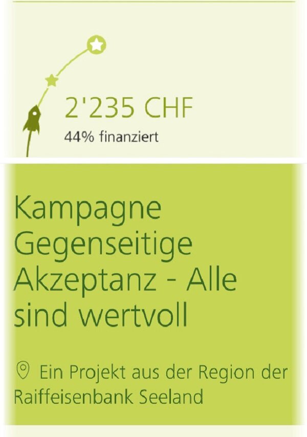 Geschätze RadioChico-Fans der erste Schritt ist gemacht, unser Projekt ist in der Finanzierungsphase. Es darf ab sofort gespendet werden. Vielen Dank an alle, die sich als Fans registriert haben. Jetzt geht es darum unser Projekt bekannt zu machen. Das könnt ihr, indem ihr zum Beispiel diesen Link teilt: https://www.lokalhelden.ch/kampagne-gegenseitige-akzeptanz Wir sind zuversichtlich, dass wir mit eurer Hilfe unser Finanzierungsziel erreichen. Das Projekt läuft bis am 6. Dezember. Liebe Grüsse und ein schönes Wochenende das RadioChico-Team