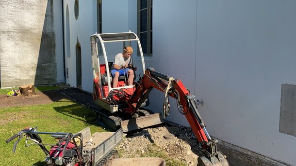 Lieber Fan Vieles ist passiert in den letzten Wochen und vieles sieht nun anders aus. Die Vorbereitungen der Baukommission liefen die letzten Tage auf Hochtouren und die Aufträge wurden vergeben. So seit den letzten Tagen auch die Umgebung der Kirche. Die Vorbereitungsarbeiten für die Sanierung sind angelaufen. Berni Bots organisiert die Freiwilligen, welche einzelne Arbeiten ausführen. So konnten wir gestern mit einigen der Jugendgruppe einen Graben und die Kirche graben. So wurde gebaggert, Steine entfernt und der ganze Schutt im Container entsorgt. Bei einem gemütlichen Essen konnten wir uns dann auch wieder stärken. Es geht also langsam etwas. Die Vorbereitungsarbeiten dauern bis in die erste Juniwoche an und dann geht es richtig los. Wir sind so natürlich weiterhin auf Spenden angewiesen. Da das Spendensammeln durch Covid-19 jedoch einen zweimonatigen Unterbruch erlitten hatte, konnten wir das Ende des Crowdfundings bis vor den Herbstferien verlängern. Somit haben wir noch weiter Zeit, um die Leute auf unser Projekt aufmerksam zu machen. Es wäre super, wenn ihr dies weiter publik macht, so dass wir weitere Fans und Unterstützer haben können ;-) Herzlichen dank dafür und blibet gsund Simon Bühler
