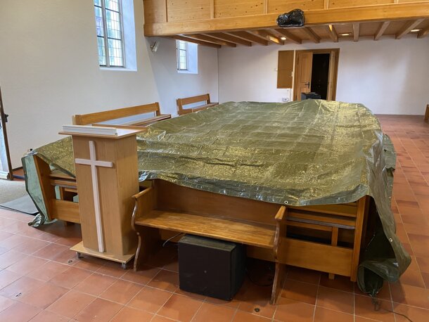 Lieber Fan Plötzlich geht alles schnell. Die Baubewilligung ist soeben eingetroffen und es kann definitiv losgehen. Ausserdem wurden diese Woche die Kirchenbänke demontiert und abgedeckt, die Orgel eingepackt und die Turmuhr wurde abgestellt. Damit die Fenstersimse nächste Woche bearbeitet werden können, wurden die untersten Fensterscheiben entfernt. Äusserlich gut sichtbar ist natürlich die Eingerüstung, welche heute den Turmspitz erreicht hatte. So kann nächste Woche mit den Hauptarbeiten begonnen werden. Bis bald, wenn es weitere News gibt Simon Bühler